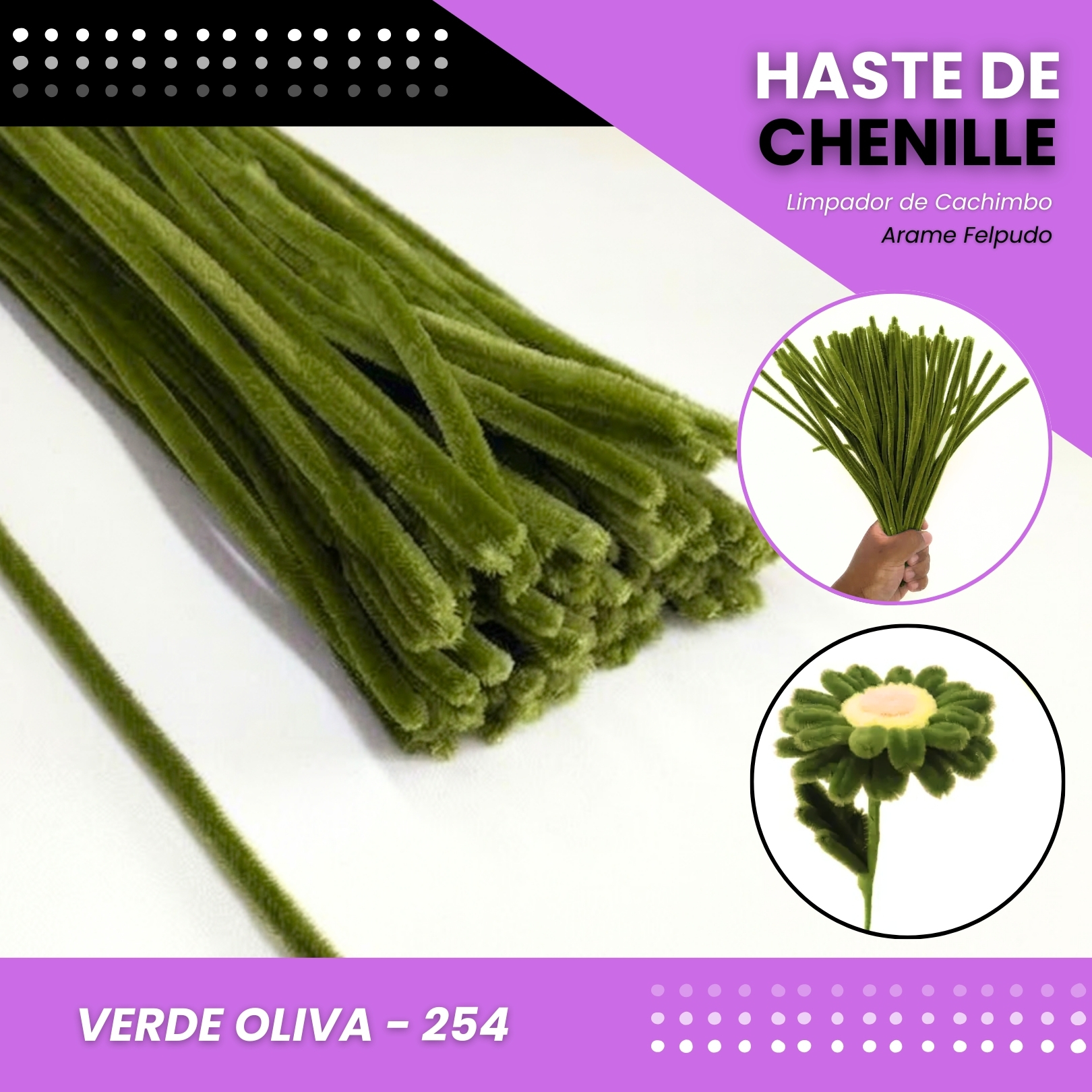 Haste de Chenille, Arame de Chenille o Limpador de Cachimbo esse produto é conhecido por muitos nomes. São arames galvanizados envolvidos com um tipo de pluma bem especifica e muito coloridos. Com eles é possivel confeccionar materiais escolares como lapis e canetas, fazer muitos brinquedos em formato de bichinhos, limpar cachimbos e muito mais.