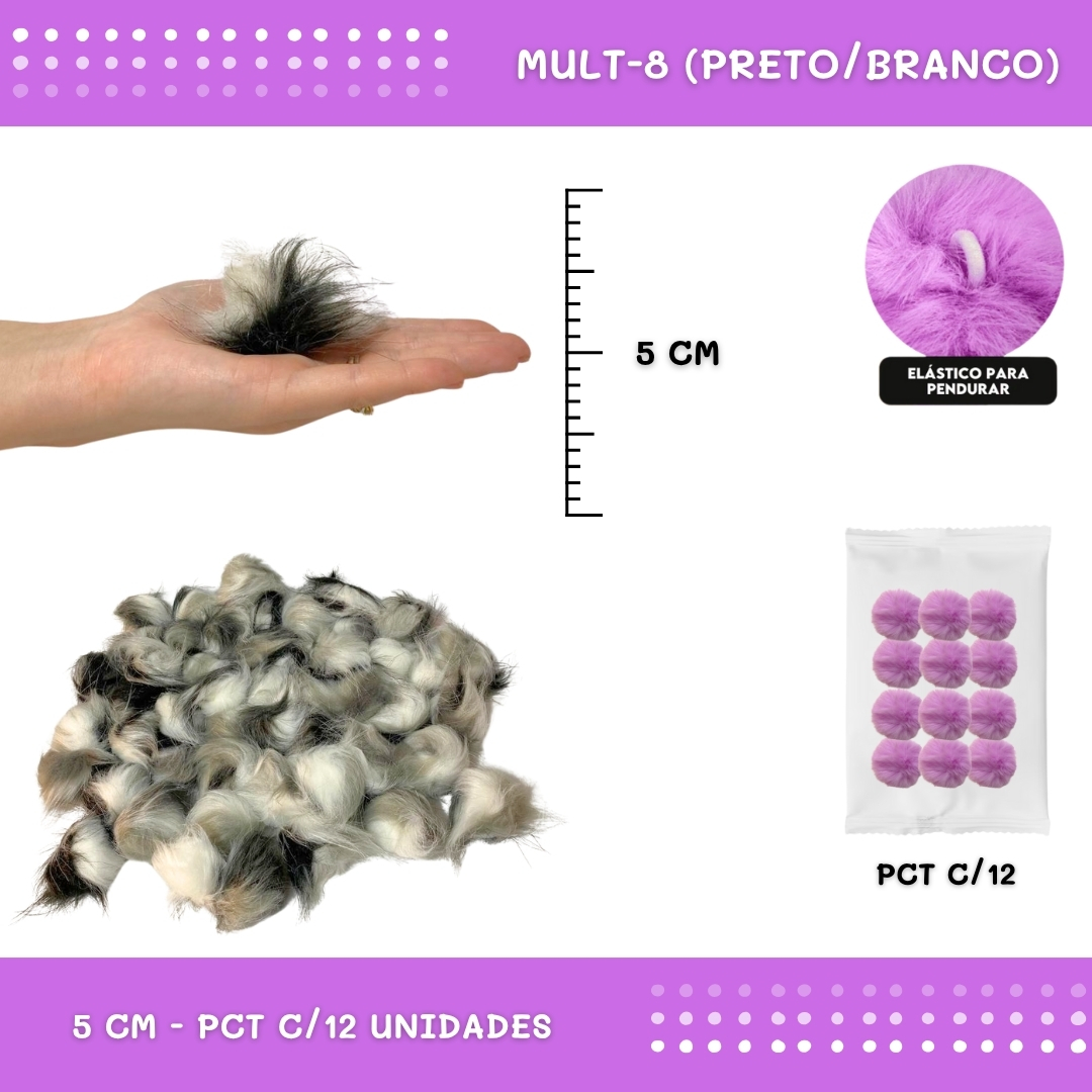 12 Unid. - Pom Pom Pelucia - 50mm COR: MULT-08 (PRETO E BRANCO)