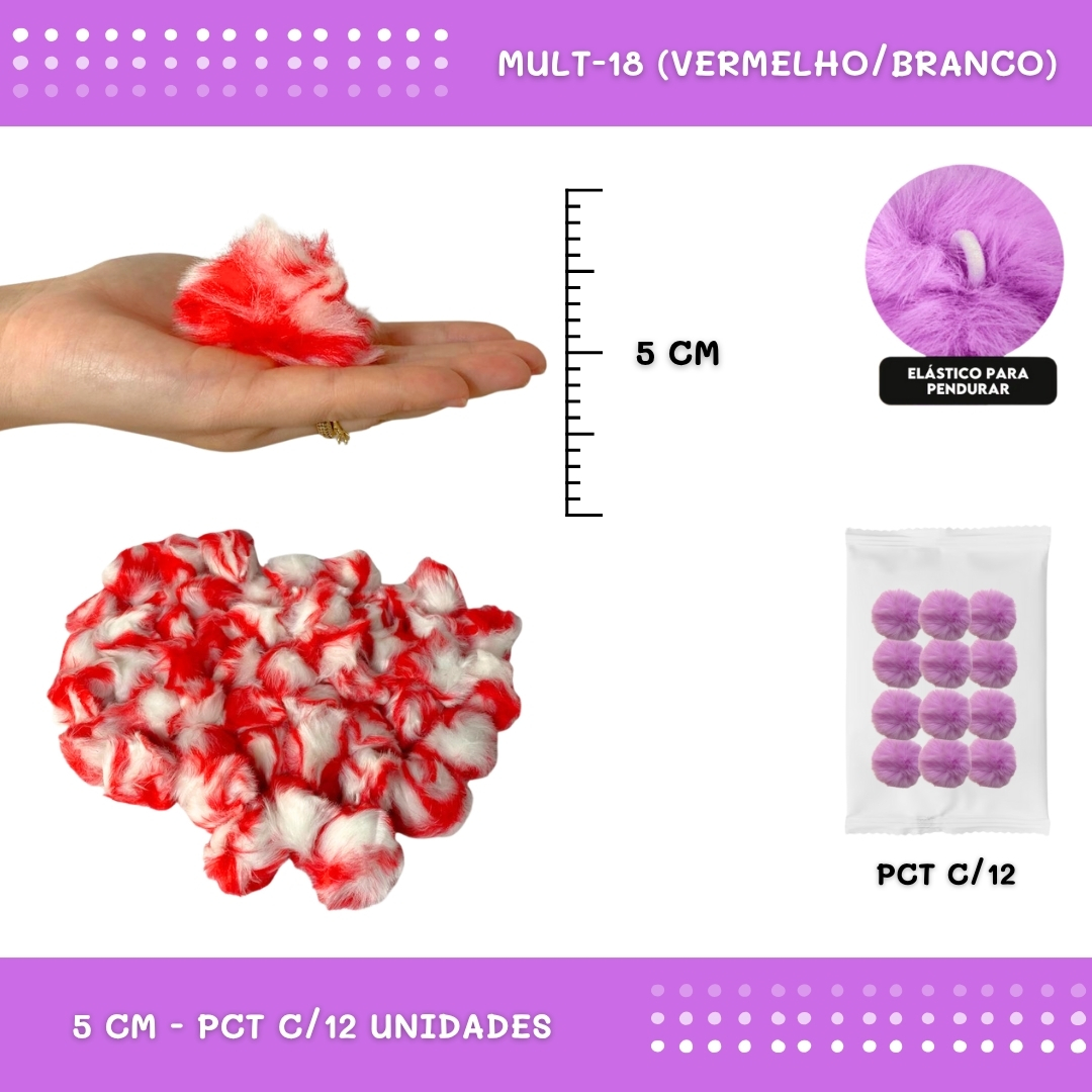 12 Unid. - Pom Pom Pelucia - 50mm COR: MULT-18 (VERMELHO/BRANCO)