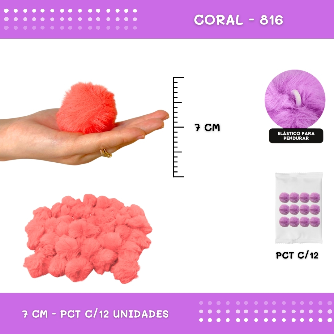 12 Unid. Pom Pom Pelucia - 70mm COR: CORAL-816