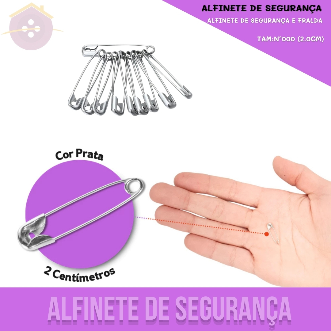 - Alfinete de Segurança - Pacotes com 100 ou 50 unidades - Cor: Prata ou Dourado - Composição: Liga de Zinco - Dimensões: | Nº000: 2cm | Nº00: 2.5cm | Nº0: 3cm | Nº1: 3.5cm | Nº2: 4cm | Nº3: 4.5cm | Nº4: 5cm | Nº5: 5.5cm Utilizado em costuras, etiquetas de roupas, crachás de corrida, etc.