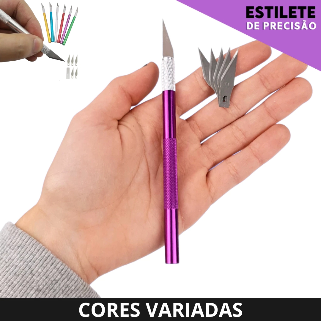 O estilete de Precisão possui lâminas pequenas, bem afiadas e em diferentes angulações, o que dá ao artista mais precisão na hora de fazer os cortes. Este produto é o ideal para os mais diversos cortes precisos, tais como como de curvas, círculos e desenhos em materiais leves, tais como papel, EVA, película, acetato, decalque e muitos outros. Desta forma ele é uma ferramenta valiosa e fundamental para trabalhos artesanais e artísticos.