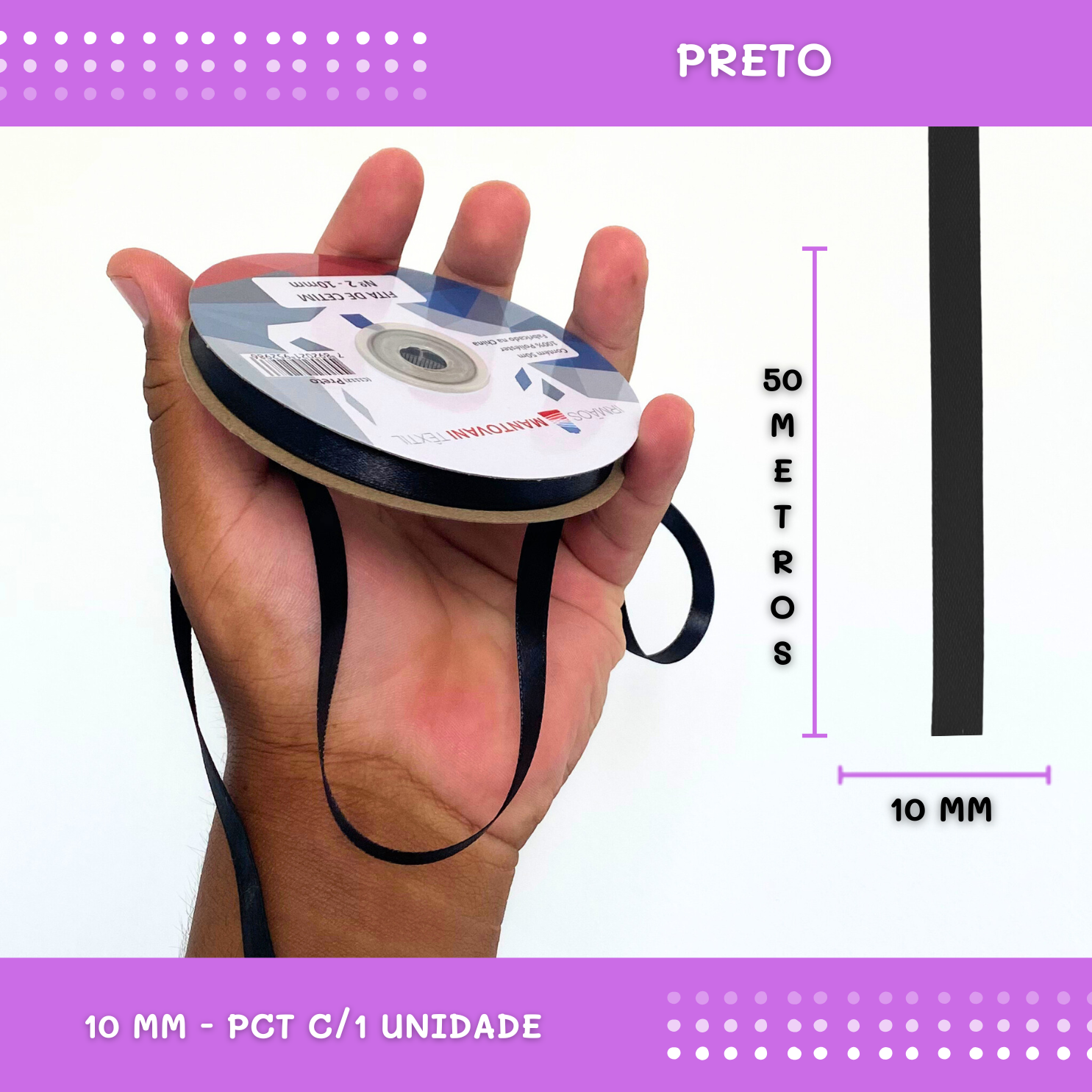 Fita de Cetim Lisa - 10mm - Rolo C/50 Mts COR:PRETO