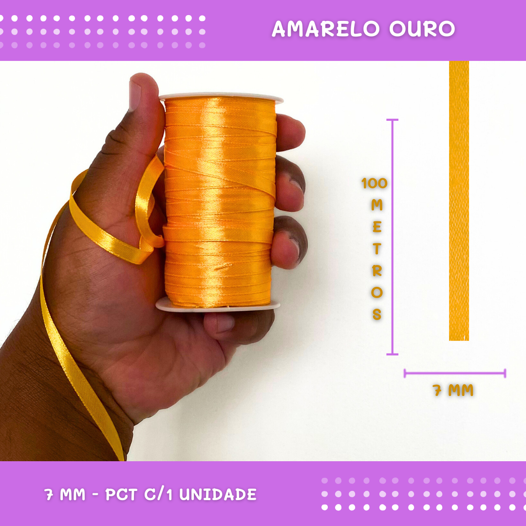 Fita de Cetim Lisa - 7mm - Rolo C/100 Metros COR: AMARELO-OURO