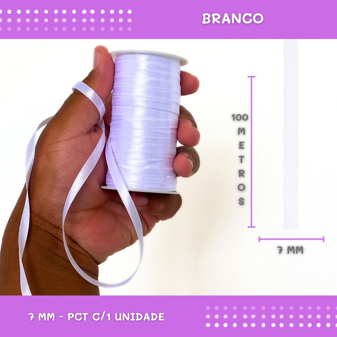 Fita de Cetim Lisa - 7mm - Rolo C/100 Metros COR: BRANCO
