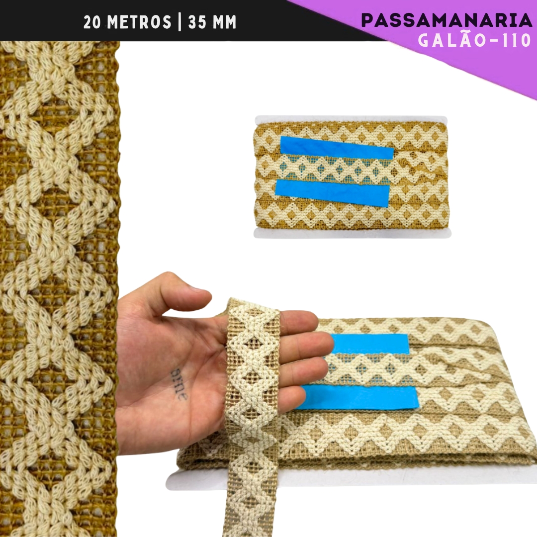 Esta linda Passamanaria com abacamento de Juta, que te permite aplicar em acabamentos de vestuário, decoração, artesanato, caimento para cortinas, lençois, toalhas e forros de mesa. Abuse da sua criatividade para criar peças incríveis com nosso Galão.