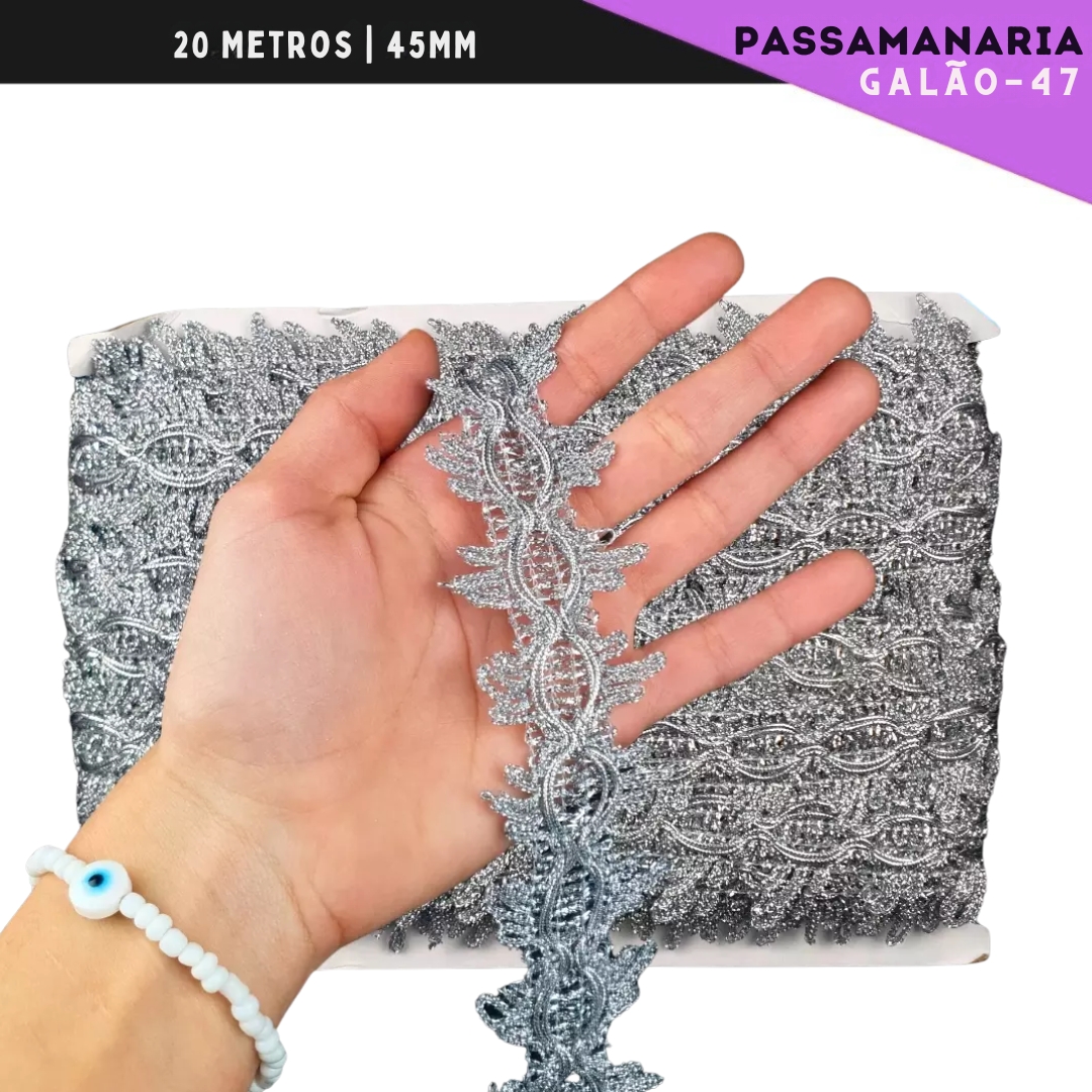 Fita Galão Passamanaria - 45mm - Ref:Galao-47 - Rolo C/20 Mts Cor:Prata