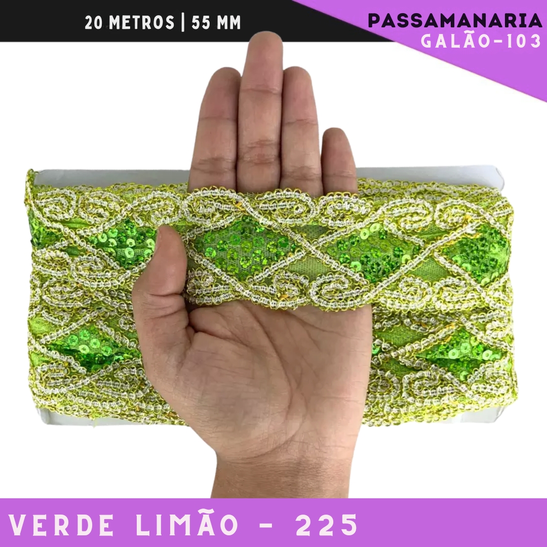 Fita Galão Passamanaria Ref:Galao-103 -55mm - Rolo C/20 Mts Cor:Verde-Limao-225