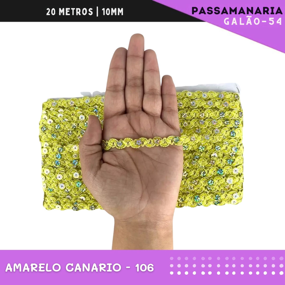 Fita Galão Passamanaria Ref:Galao-54-10mm - Rolo C/20 Mts Cor:Amarelo-Canario-106