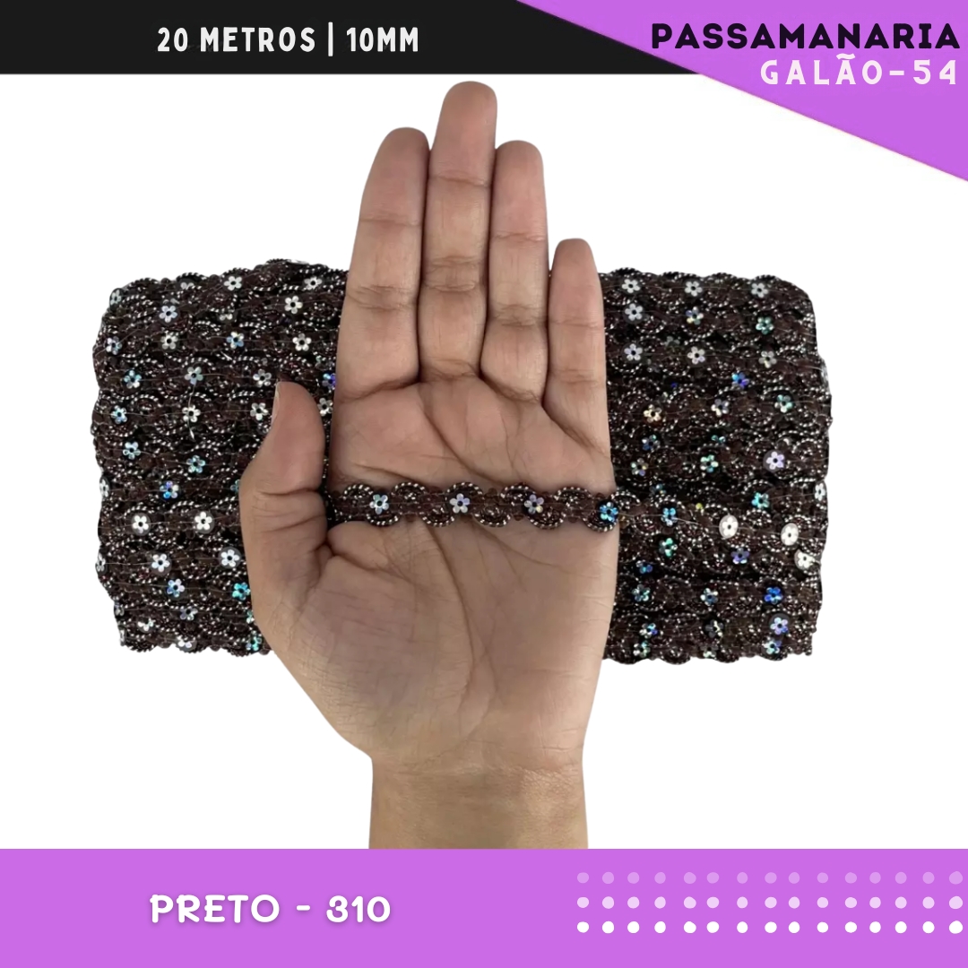 Fita Galão Passamanaria Ref:Galao-54-10mm - Rolo C/20 Mts Cor:Preto-310