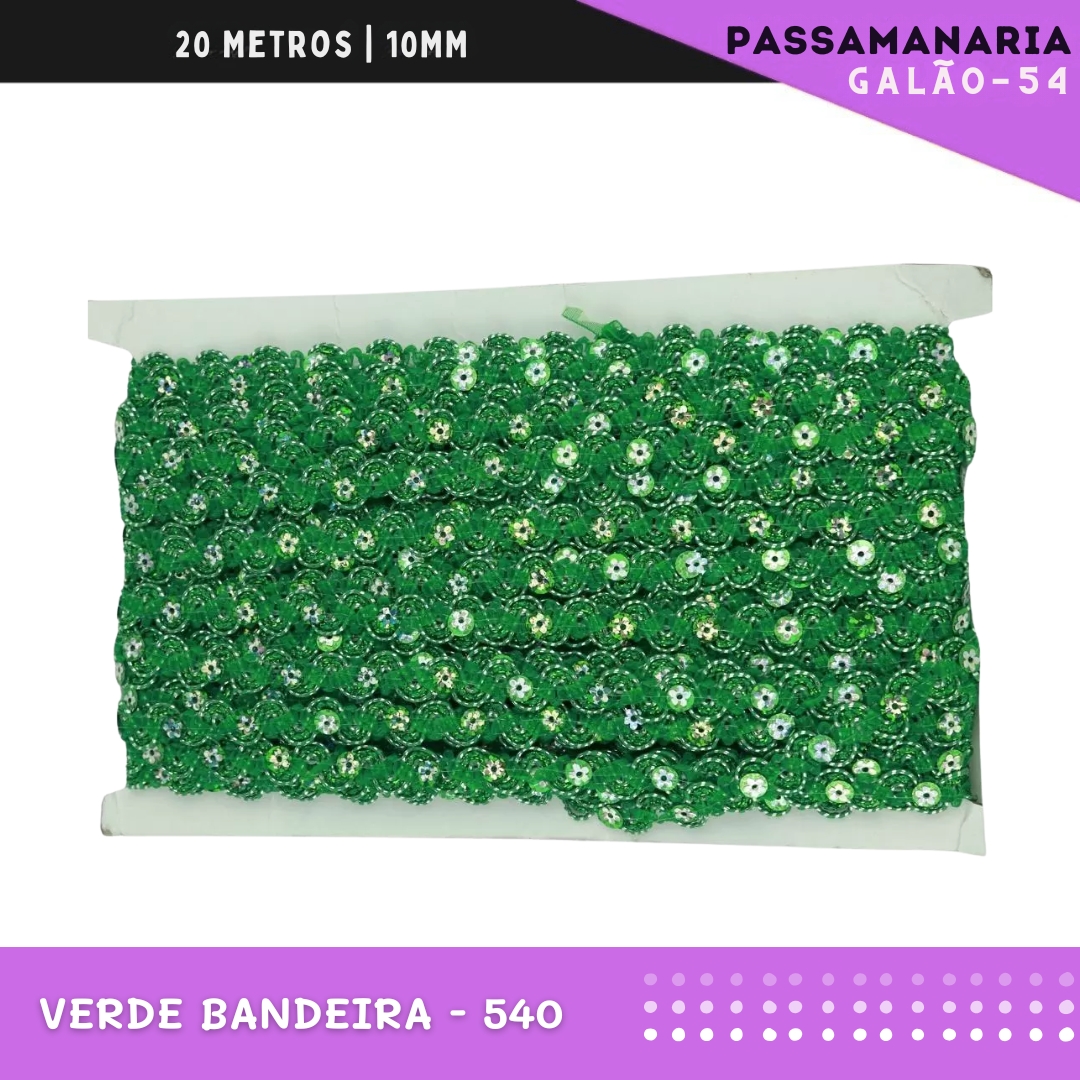Fita Galão Passamanaria Ref:Galao-54-10mm - Rolo C/20 Mts Cor:Verde-Bandeira-540