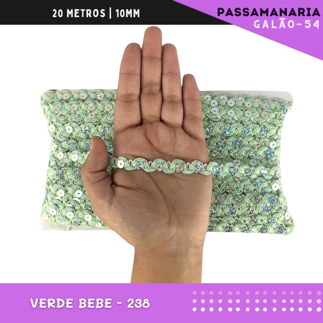 Fita Galão Passamanaria Ref:Galao-54-10mm - Rolo C/20 Mts Cor:Verde-Bebe-251