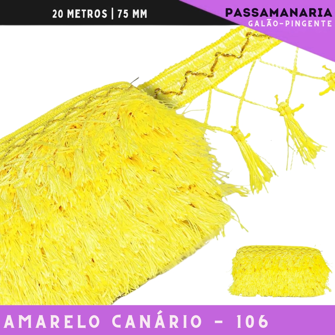 Fita Galao Pingente De Seda Tassel - 7,5 Cm - Passamanaria Franja - Rolo C/ 20 Mts Cor:Amarelo-Canario-106