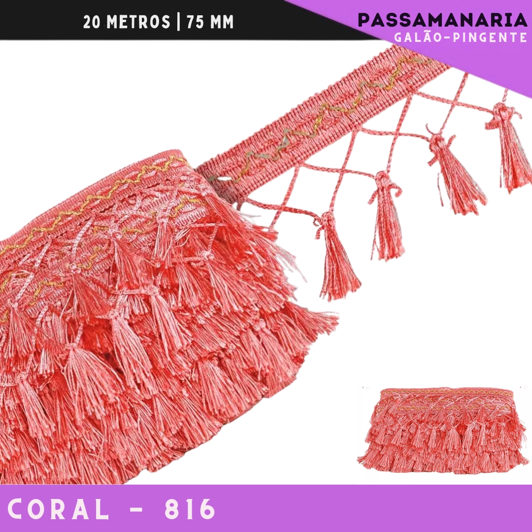 Fita Galao Pingente De Seda Tassel - 7,5 Cm - Passamanaria Franja - Rolo C/ 20 Mts Cor:Coral-816