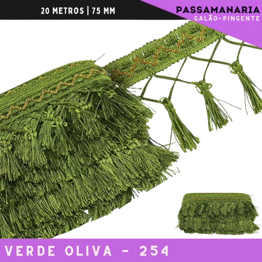 Fita Galao Pingente De Seda Tassel - 7,5 Cm - Passamanaria Franja - Rolo C/ 20 Mts Cor:Verde-Oliva-254