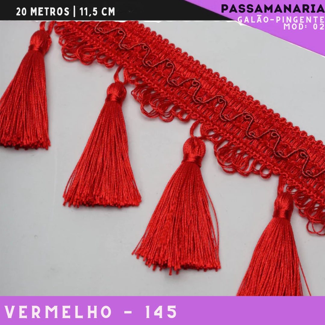 Galão de Franja Pingente Tassel Luxo Premium - Rolo c/20 mts - 11.5 cm - Grade de Cores COR:VERMELHO-145