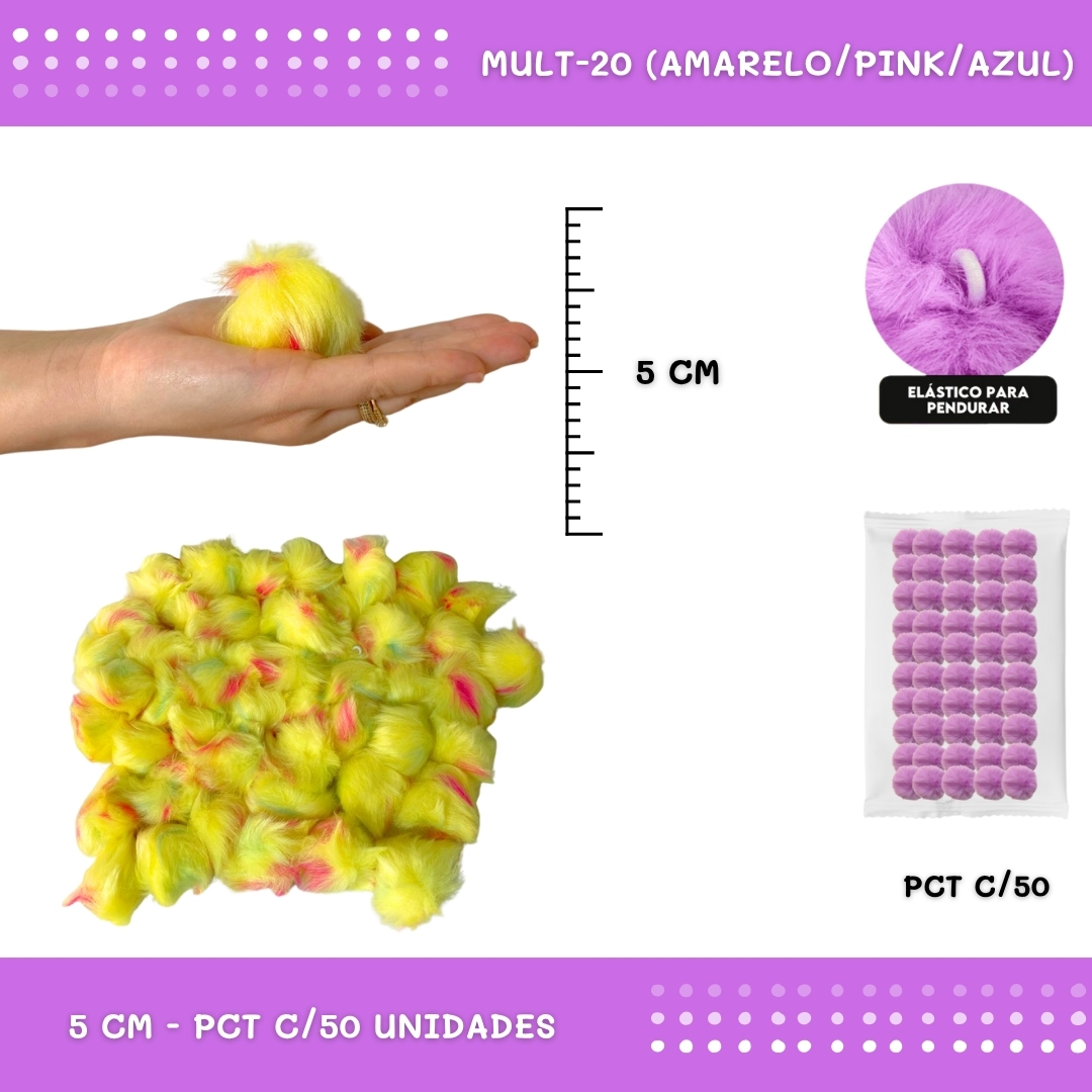 Pom Pom Pelucia - 50mm - Pct C/50 Unid. COR: MULT-20 (AMARELO/PINK/AZUL)