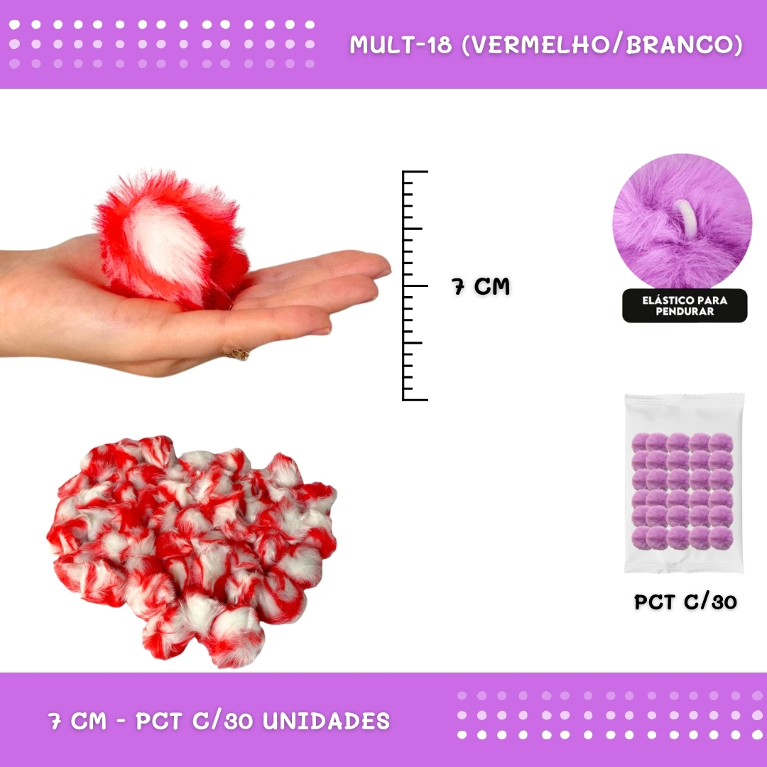 Pom Pom Pelucia - 70mm - Pct C/30 Unid. COR: MULT-18 (VERMELHO/BRANCO)