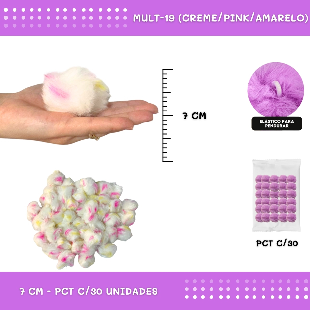 Pom Pom Pelucia - 70mm - Pct C/30 Unid. COR: MULT-19 (CREME/PINK/AMARELO)