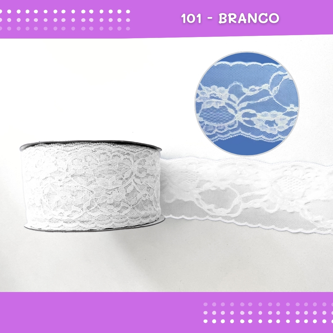 Renda De Poliamida R004 - 75mm - Rolo C/ 50 Mts Cor:Branco-101
